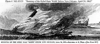 CSS Webb, a 655-ton side-wheel steam ram, was originally built in New York City in 1856 as the civilian steamship William H. Webb. She received a Confederate privateer's commission at New Orleans in May 1861, but was instead employed as a transport until January 1862. Converted to a "cotton clad" ram by the Confederate Army, thereafter served on the Mississippi and Red Rivers. On February 24, 1863, under the command of Captain Charles Pierce, she participated in the sinking of the Federal ironclad USS Indianola. Webb was transferred to the Confederate Navy in early 1865.[2][3] On April 23โ24, 1865, under the command of Charles S. Read, Webb broke through the Federal blockade at the mouth of the Red River, Louisiana, and made a dramatic run down the Mississippi toward the Gulf of Mexico. After eluding several United States Navy vessels and passing New Orleans, she was confronted by the powerful steam sloop USS Richmond. Rather than face the veteran ship's broadside, the Webb was run ashore and destroyed by her crew.[4]
