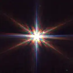 In 2006 and 2007, a faint companion was observed 2.7 arcseconds away from CT Chamaeleontis, using the Very Large Telescope at the European Southern Observatory. Since the object shares common proper motion with CT Chamaeleontis, it is believed to be physically close to the star, with a projected separation of approximately 440 astronomical units. It is estimated to have a mass of approximately 17 Jupiter masses and is probably a brown dwarf or a planet.[4] The companion has been either designated as CT Chamaeleontis b[12] or as CT Chamaeleontis B, sometimes erroneously as low-mass star.[13] The companion was proven to be most likely in the brown dwarf mass range in 2015.[7]