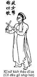 Ca trù (Vietnamese: [kaː ʈû], 歌籌, "tally card songs"), also known as hát cô đầu or hát nói, is a Vietnamese genre of musical storytelling performed by a featuring female vocalist, with origins in northern Vietnam.[1] For much of its history, it was associated with a pansori-like form of entertainment, which combined entertaining wealthy people as well as performing religious songs for the royal court.[2][3]