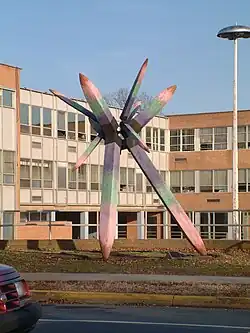 In 2002, the city dedicated Sentinel #3 (known simply as Sentinel), a statue by Jim Paulsen, to CCSA to mark its tenth anniversary.[14] Paulsen refurbished the wood and metal structure in early 2002 after vandals destroyed the initial design, unveiled in 1985.[15] CCSA and Charter students helped with the restoration and the statue was moved from downtown Wilmington to the front of Cab Callway School in fall 2002.[14] In 2003, Sentinel was again the target of vandalism; the perpetrator cut through one of the structure's supporting legs, which cost about $800 to repair.[16] A fundraiser was held to cover the cost.[16]