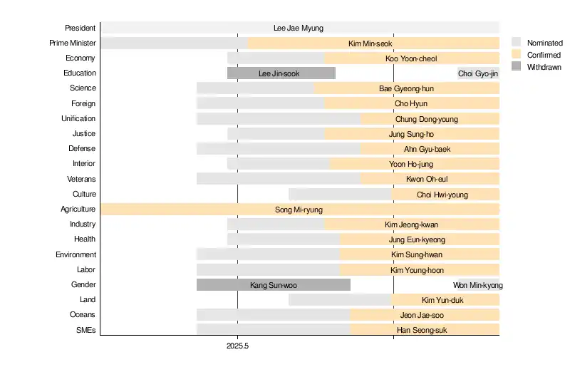 On 3 July 2025, the South Korean National Assembly voted to approve the nomination of Kim Min-seok as Prime Minister in a 173-3 vote.[20] Kim would then be sworn in as Prime Minister on 7 July 2025.[21] The post of prime minister is the only cabinet level position which requires National Assembly approval in South Korea.[20] As of 30 June 2025, Lee has nominated 17 of 19 cabinet ministers.[22] On 11 July 2025, the last two remaining cabinet ministers were named, thus finalizing the lineup for Lee Jae Myung's 19-member cabinet.[23][24] The cabinet now awaits official presidential confirmation.[24] On 13 July 2025, Lee appointed 12 vice ministers. One notable appointment was Hong So-young, who would become the first woman to serve as commissioner of the Military Manpower Administration since the administration was founded in 1970.[25]