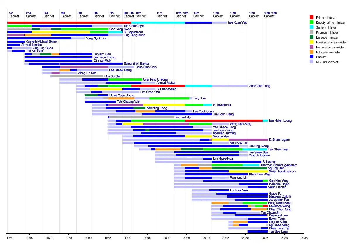 - 1st Cabinet (formed June 1959): Lee Kuan Yew (PM), Toh Chin Chye (DPM), Goh Keng Swee, Ong Pang Boon