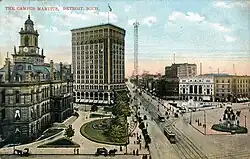 Cadillac Square in 1899, City Hall is on the left and the Majestic Building is to the right -