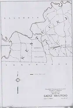 The Cadiz Railroad was a shortline railroad originating in Cadiz, Kentucky.[1][2] Incorporated in 1901, it ran to a connection with the Illinois Central Railroad at Gracey, Kentucky, a distance of ten miles. The line started service in 1902.[3] In 1984, it obtained an additional 18 miles with the lease of the Illinois Central line from Gracey to Princeton, Kentucky.