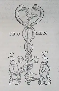 The caduceus appears in a general medical context in the printer's device used by the Swiss medical printer Johann Frobenius (1460–1527), who depicted the staff entwined with serpents and surmounted by a dove, with a biblical epigraph in Greek, "Be ye therefore wise as serpents and harmless as doves" (Matthew 10:16, here in the KJV translation),[5] in keeping with the connotations of the caduceus as a symbol of messengers and publishers based on the association of Hermes or Mercury with eloquence and negotiation. Friedlander observed that Frobenius could hardly be considered a medical printer, as had previously been asserted, noting that in a review of 257 of the works bearing this printer's device only one was related to medicine. Similar use of the caduceus in printers' marks continues to the present day, with companies including F. A. Davis Company still using the symbol as an element of their insignia.