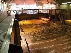 There are further indications that significant ruins or building survived into the medieval period. The vast stone complex of the fortress baths are thought to have been destroyed in the 13th century,[4] and the ditch at 10 Mill Street was identified as still standing open in the Middle Ages.[5] An engraving of 1783 shows a crumbling tower and Roman stonework.[6]