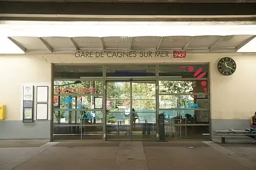 Gare de Cagnes-sur-Mer is a railway station serving Cagnes-sur-Mer, Alpes-Maritimes department, southeastern France. It is located on the Marseille–Ventimiglia railway, between Cannes and Nice. The station is served by regional trains (TER Provence-Alpes-Côte d'Azur) to Cannes, Grasse, Antibes and Nice.[1][2]