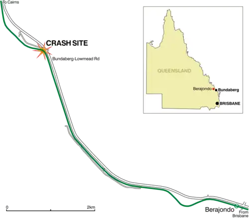 Departing Bundaberg two minutes early at 11:11 pm with a driver and co-driver, five passenger service attendants and 150 passengers, the train reached Berajondo at 11:50 pm. Four minutes later, after passing through a series of curved sections of track with speed restrictions between 60 km/h (37 mph) and 80 km/h (50 mph), the co-driver left his seat and driver's cabin and went to a vestibule area adjacent to make a "brew" for the driver,[7] as he had complained about the quality of the beverage offered at Bundaberg.[5]