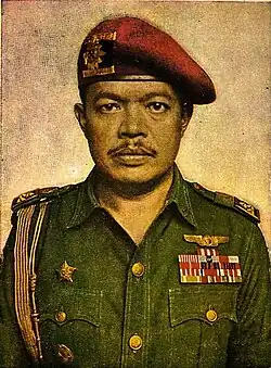 The Tjakrabirawa Regiment was formed on 6 June 1962 by President Sukarno at the suggestion of army officers after attempts to assassinate the head of state, most recently on 14 May that year.[1] Its primary task was to provide security for the president and his family. Security for the president consisted of individual protection and area protection. Its personnel were recruited from all branches of the Indonesian military, such as the Army Raiders and the Army Parachute Commandos, the Navy Commando Operations Corps (KKO), the Air Force Rapid Action Force (PGT) and Police Mobile Brigade (BRIMOB).[2] The first commandant and executive officer were Brigadier General M. Sabur and Colonel Maulwi Saelan. President Sukarno gave the name "Tjakrabirawa" after Krishna's fictional sacred weapon in wayang mythology. The regiment badge was a golden "Cakra" in a dark red pentagonal field. Its members wore a brick red beret, pushed to the left.[3][4]