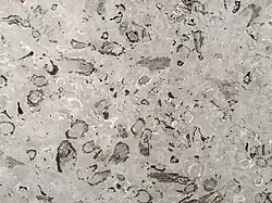 The formation is characterized by lagoonal facies with episodes of higher energy and rare bivalve patch reefs, such as Chondrodonta and Rudists, which are found throughout the entire unit. The lower section, referred to as the "Zolla member" consists of bivalve-rich limestone, including rudists and Chondrodonta, as well as foraminiferal limestone, often interbedded with dolomitized dark wackestones. In the upper part of this member, pelagic limestone with Pythonella fossils is present.[15][16] The main body of the Aurisina Limestone is characterized by peritidal carbonates, with some dark laminated facies, dominated by rudists, benthic foraminifera, cyanobacteria (Decastronema), and algae (Thaumatoporella).[17][18] The Paleoenvironment of this unit is accepted to be a succession of emerged and shallow marine carbonate platform settings, including inner lagoons, high-energy shoals, tidal channels, and rudist accumulations[15][19] The complex dolomitization and silicification in the region may be linked to a Monsoon climate with alternating wet and dry periods. Comparable dolomitization occurs across the Adriatic Platform, particularly in the Middle-Lower Cenomanian.[20]
