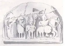 The bas-relief is classified as a tombstone, on which a Roman officer is shown on horseback carrying a shield.[3] Behind the officer is the standard bearer with his insignia.[4] As of Baddeley’s publication in 1925, the stone was still embedded within the inner barn wall.
