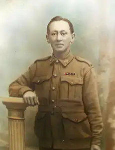 Caleb James Shang DCM & Bar, MM (born Duckbour Caleb James Shang; 4 August 1884 – 6 April 1953)[1][a] was the most highly decorated Chinese Australian soldier who served in the First World War. He was decorated with the Distinguished Conduct Medal twice and received the Military Medal.[2][3][4][5][b] He served with distinction on the Western Front, primarily as a scout and sniper, until his wounds rendered him unfit for further duties. After returning to Australia, Shang married in Victoria and moved to Queensland, where he and his wife raised their three children. During the Second World War, he served on home defence duties in northern Queensland.[6]