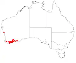This species of blue tinsel lily occurs from Albany and Stirling Range National Park east to Hopetoun. It is scattered in the Stirling Range, Fitzgerald River and Frank Hann national parks, growing on quartzite sands, in mallee woodland or heath often over laterite or granite.[1]