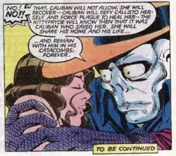 Shortly thereafter, Callisto desires a consort and has the Morlocks abduct Angel to be her husband. The X-Men arrive in the sewers to rescue their ally, and Kitty is infected with a virus by Plague. Caliban takes her to his quarters to care for her. Kitty pleads with Caliban to allow her to assist her teammates. Caliban agrees, but only if she will return after the fight and stay with him. Though Kitty promises to stay with him forever, she leaves and returns home.[3] Weeks later, Callisto, vengeful after losing a one-on-one battle with Storm, orders the Morlocks to kidnap Kitty to force her to marry Caliban, knowing Storm would return. Caliban, however, realizes that Kitty does not truly love him and releases her.[4]