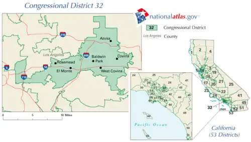 Under the 2020 redistricting, California's 32nd congressional district is located in Southern California. Half of the district covers the westernmost border of Los Angeles County, while the other half extends to the western areas of the City of Los Angeles.