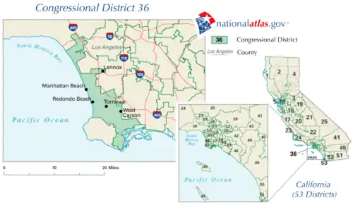 California's 36th congressional district is a U.S. congressional district in California. The 36th district is located primarily in the South Bay and Westside regions of Los Angeles. It takes in the cities of Beverly Hills, Santa Monica,
