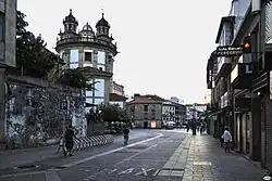 The beginning of the street coincides with the back of the Church of the Pilgrim Virgin, one of the most iconic buildings in Pontevedra, classified as a Site of Cultural Interest. It is a circular baroque temple with neoclassical elements and a scalloped plan, completed in 1792.[27]