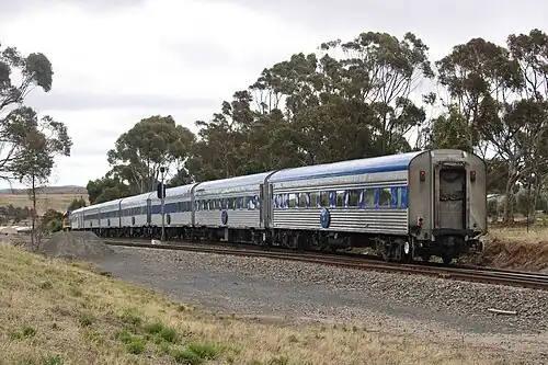 ![]() The Overland train passing the former Callington station yard, December 2023. | |||||||||||