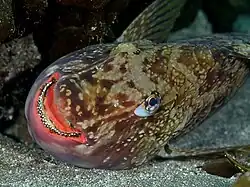 The body of the fish is a red-brown color, and is spotted with white and light gray. The species has an interrupted lateral line. Its iris is yellow with a dark brown blotch.[2]