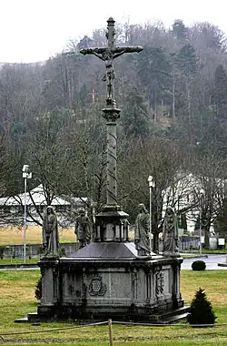 The most notable Calvary monument outside Brittany is at Lourdes. This was specifically intended to represent Breton Catholicism. It was created by the sculptor Yves Hernot in 1900 as a gift to Lourdes from the main Breton dioceses: Rennes, Vannes, Quimper and Saint-Brieuc.[4] The monument comprises a single central cross set within a raised square base at each corner of which a statue of one of the witnesses to the crucifixion is placed.