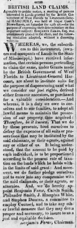 - ^ "Mississippi, as a province, territory and state, with biographical notices of eminent citizens... V. I." HathiTrust. p. 109. hdl:2027/uva.x001707298. Retrieved 2024-07-14.