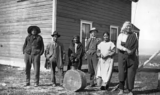 ![]() Far right: Flathead elders Susie Magpie and Michael Wyateelame, pictured at Camas Prairie c. 1917; third from right, Harold Flower (Denver Public Library Special Collections X-31065) | |