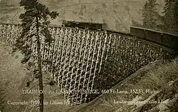 Among the line's notable features are the curved timber-frame trestle Bridge 22, known as "Half-moon Trestle".[12] This bridge, partially visible from U.S. Route 95,[13] has a length of 685 feet (209 m) and is 141 feet (43 m) high, and was built with almost 1 million board-feet of lumber.[14] Tunnel 1, called "horeshoe tunnel", bends at such an angle that neither end can be seen from the middle.[13] This tunnel, and several others are either timber-framed or have timber-framed entrances.[12]: 6 In addition to its wooden trestles, the railroad's second subdivision also had a sizable steel viaduct, 1,520 feet (463 m) in length with a maximum height of 280 feet (85 m).[12][15] Known as Bridge 38 (46°12′N 116°25′W / 46.2°N 116.42°W), it spans Lawyer's Canyon between Craigmont and Ferdinand, and is also visible from U.S. 95.