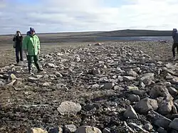 The first known people to occupy the area were the Pre-Dorset people, somewhere around 1800 BCE, about 4,000 years ago, and were seal and caribou hunters.[15] The next group to enter the area were a Paleo-Eskimo peoples known as the Dorset, who arrived approximately 500 CE. They were the first known people to have fished for the Arctic char.[16] The last of the Paleo-Eskimo people, who appeared here about 800 CE, were the Tuniit, and evidence of their living quarters can be seen close to Cambridge Bay. The Tuniit, who were known to the Inuit as giants, were taller and stronger than the Inuit, but were easily scared off.[17][18]