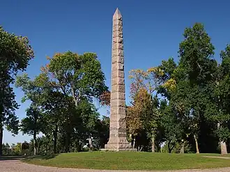 Camp Release State Monument is located on the edge of Montevideo, Minnesota, United States, just off Highway 212 in Lac qui Parle County, in the 6-acre Camp Release State Memorial Wayside.[2] The Camp Release Monument stands as a reminder of Minnesota's early state history. The Minnesota River Valley and Montevideo were important sites in the Dakota War of 1862.