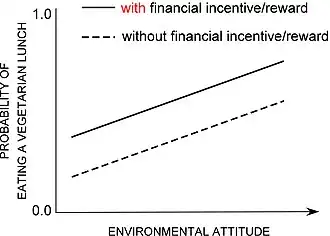 The literature contains a considerable number of (sometimes contradictory) conjunctive behavioral explanations[29] that speak of the cost-moderated efficacy of people's attitudes (see Fig. 2a).[30][31][32][33] By contrast, the Campbell Paradigm suggests that behavioral costs are unrestrictedly behaviorally effective and independent of people's attitude levels (see Fig. 2b). In other words, financial rewards make vegetarian lunches more probable for everyone.[34] This countervailing relationship between behavioral costs and attitude has been repeatedly quasi-experimentally confirmed in environmental protection research.[35][36][37]