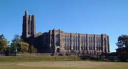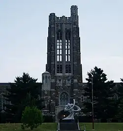 B.C.C. is widely recognized for the architectural distinction of its main academic building, known as "The Castle on the Hill." Completed in 1928, the structure was designed by Riggin T. Buckler and G. Corner Fenhagen in the Collegiate Gothic style. The three-story building features a central 150-foot tower, random ashlar stonework with Indiana limestone trim, arched windows, carved gargoyles, buttresses, and ornamental tracery—reflecting both academic tradition and civic grandeur.[6]