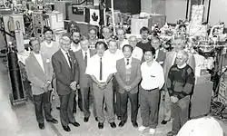 The X-ray intensity from Aladdin was much higher than on Tantalus, especially in the photon energy range up to 4000eV. These higher energies were potentially available using higher energy monochromators than the Grasshopper. In 1987, with Bancroft now chair of the Chemistry department at UWO he planned for a new beamline to cover the 1500-400eV energy range. A successful application was made to the recently formed Ontario Centre for Materials Research, and T.K. Sham was hired away from Brookhaven National Laboratory to design the beamline.[1] A double crystal monochromator (DCM) was selected, to be built by the Madison Physical Sciences Laboratory, using a cylindrical mirror with a novel bending mechanism to focus the X-ray beam after the monochromator.[6] B.X. Yang, also from Brookhaven, was hired in 1988 to construct the beamline.[1] The beamline was built in less than 18 months, and was officially opened in 1990.[1] The CSRF DCM beamline was regarded as particularly notable by SRC as it was the only beamline at the facility to reach energies higher than 1500 eV.[7] With two beamlines, use by the Canadian community increased, with more than 40 scientists from 10 Canadian institutions using the facility from 1990 to 1992. Funding was now stable and adequate, with no charges to users.[1]