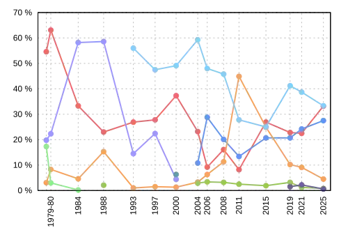 | Election | Liberal | Bloc Québécois | New Democratic | Conservative | Green | PC | Reform / Alliance |