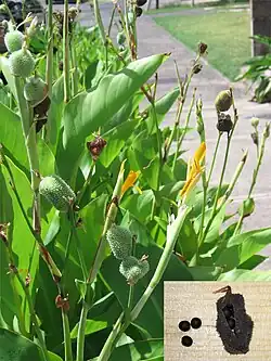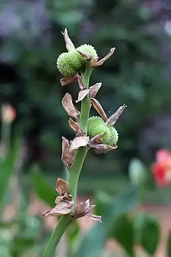 Seeds are produced from sexual reproduction, involving the transfer of pollen from the stamen of the pollen parent onto the stigma of the seed parent.[6] In the case of Canna, the same plant can usually play the roles of both pollen and seed parents, technically referred to as a hermaphrodite. However, the cultivars of the Italian group and triploids are almost always seed sterile, and their pollen has a low fertility level. Mutations are almost always totally sterile.[9]