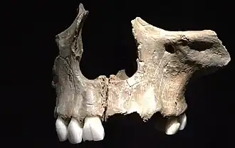 The oldest archaeological evidence of hominid cannibalism comes from the Gran Dolina cave in northern Spain. The remains of several individuals who died about 800,000 years ago and may have belonged to the Homo antecessor species show unmistakable signs of having been butchered and consumed in the same way as animals whose bones were also found at the site.[13] They belong to at least eleven individuals, all of which were young (ranging from infancy to late teenhood).[14] A study of this case considers it an instance of "nutritional" cannibalism, where individuals belonging to hostile or unrelated groups were hunted, killed, and eaten much like animals. Based on the placement and processing of human and animal remains, the authors conclude that cannibalism was likely a "repetitive behavior over time as part of a culinary tradition", not caused by starvation or other exceptional circumstances.[15] They suggest that young individuals (more than half of which were children under ten) were targeted because they "posed a lower risk for hunters" and because this was an effective means for limiting the growth of competing groups.[16]