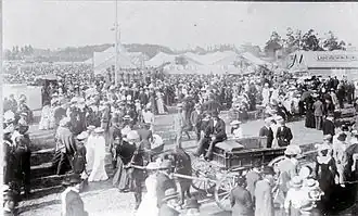 The first Agricultural and Pastoral Show in Christchurch was held in a paddock north of Latimer Square on 22 October 1862.[1] The Canterbury A&P Association was formed a few weeks later on 23 January 1863, with Robert Wilkin as its first president.[1] In April 1863, the A&P Association purchased 14 acres (5.7 ha) in Colombo Street South for show grounds; this is now Sydenham Park.[1] In November 1887, new show grounds opened in Addington.[2][3]