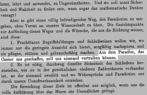 Cantor's paradise is an expression used by David Hilbert (1926, page 170) in describing set theory and infinite cardinal numbers developed by Georg Cantor. The context of Hilbert's comment was his opposition to what he saw as L. E. J. Brouwer's reductive attempts to circumscribe what kind of mathematics is acceptable; see Brouwer–Hilbert controversy.