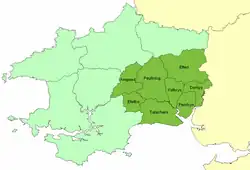 The name means "upper-most zone".[2] Its area was about 244 square miles (630 km2). Unlike the other Dyfed cantrefi which were divided into two (or fewer) commotes, Cantref Gwarthaf was divided into eight commotes: Amgoed, Derllys, Efelfre, Elfed, Penrhyn, Peuliniog, Talacharn, and Ystlwys. Its civil headquarters were at Carmarthen. Its ecclesiastical centre (and perhaps, in the Age of the Saints, the seat of a bishop[3]) was probably also Carmarthen, although the churches at Llanddowror and Meidrim were also important.