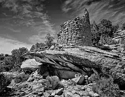 The Painted Hand Pueblo is a backcountry site that consists of non-excavated ruins built upon boulders along a cliff-face and a standing tower. The pueblo received its name from a boulder with pictographs of hands.[12] |