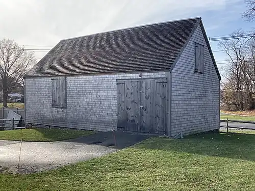 Historic Barn (c. 1740) at the Cape Ann Museum Green.1936: the Cape Ann Historical Association added a two-story addition behind the Elias Davis House on Federal Street. This addition contains additional exhibition space and a ground floor auditorium. The addition was conceived as a separate building, but was connected to the Davis House shortly after it was built. A new entrance was also built adjacent to the Davis House. The construction was funded by the Catalina Davis Fund. Catalina Davis also donated most of the family heirlooms now on display in the Captain Elias Davis House and bequeathed an endowment to help fund the museum in perpetuity.[7]
