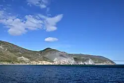 Cape Dezhnyov or Cape Dezhnev (Russian: мыс Дежнёва; Eskimo–Aleut: Tugnehalha; Inupiaq: Nuuġaq),[1] formerly known as East Cape or Cape Vostochny, is a cape that forms the easternmost mainland point of Asia. It is located on the Chukchi Peninsula in the very sparsely populated Chukotka Autonomous Okrug of Russia. This cape is located between the Chukchi Sea and the Bering Strait, 82 kilometres (51 mi) across from Cape Prince of Wales in Alaska; the Bering Strait is delimited by the two capes. The Diomede Islands and Fairway Rock are located in the midst of the strait.[2]