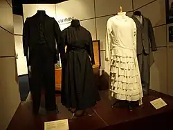 Cape dresses provide a modest double layer in the bodice area. They also provide a long, full, skirt that conceals the form and falls at least below the knee and sometimes down to the ankle, depending upon the Christian denomination. Cape dresses are traditionally worn by female Anabaptist Christian church members, such as Mennonite, Brethren, Amish and Charity women.[3][4] Along with the adjective kosmios (κόσμιος) meaning "modest", 1 Timothy 2:9–10 uses the Greek word catastola katastolé (καταστολῇ) for the apparel suitable for Christian females, and for this reason, women belonging to traditional Anabaptist denominations often wear a cape dress; for example, members of the Charity Christian Fellowship (an Anabaptist denomination) wear the cape dress as the denomination teaches that "the sisters are to wear a double layered garment as the Greek word 'catastola' describes."[4] Cape dresses have additionally been worn by traditional Christians of the Quaker and Shaker denominations, among others.[5]