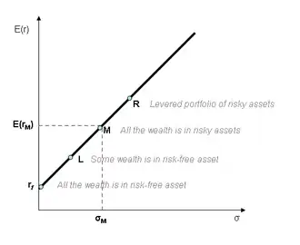 Addition of leverage (the point R) creates levered portfolios that are also on the CML.