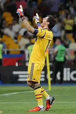 Iker Casillas, as captain of the Spain national football team, wearing a captaincy armband on his left arm