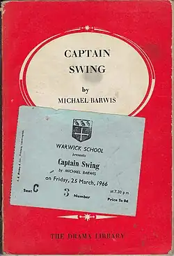 Captain Swing (1965) is a play for schools, set at the time of the Bristol Riots (1831).[1] The play represents the emotions and the types of people involved in the riots and their climax which occur in any revolution — the realist and the idealist; the pacifist and the militant; the honest and the phoney; and the martyrdom and suffering of the comparatively innocent.[2]