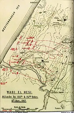 On the far left of the EEF pursuit, the 157th Brigade (52nd Division) and attached cavalry, artillery and engineers, had advanced seven miles (11 km) north of Gaza along the shore covered by cliffs, to within one point five miles (2.4 km) of the Ottoman army entrenchments on the banks of the Wadi el Hesi, the sand dunes giving good cover to their approach from the south.[21][22][40][50] By dusk on 7 November, the 157th Brigade had reached and crossed the Wadi el Hesi near its mouth.[13][29]