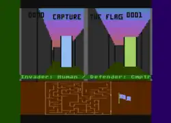 Capture the Flag is a 3D first-person perspective, two player, video game, released for the Atari 8-bit computers and VIC-20 by Sirius Software in 1983. It was written by Paul Allen Edelstein as the follow-up to his 1982 game, Wayout, which has similar maze-based gameplay for one player. Along with its predecessor, Capture the Flag was among the first 3D maze games to offer the player full 360 degree movement,[2] and one of the earliest multiplayer games from a first-person perspective within a 3D rendered environment.