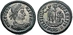 Carausius' supposed title of Caesar, while more sensical in the fourth century than the fifth, is still rather unusual for a completely independent usurper, as it implies some level of subservience to a more senior Augustus. On this, Stevens drew parallels to Vetranio, writing, "There is numismatic evidence to suggest that at this stage Vetranio contented himself with the title of Caesar, thus recognizing the primacy of Constantius as Augustus, and only assumed that of Augustus when pressure from Magnentius forced him to declare himself, whether seriously or not, against Constantius." The numismatic evidence that Stevens cites here is a single, unique coin, whose legends declare "VETRANIO NOB CAES" (Vetranio, most noble Caesar).[14] While the coin's authenticity had been questioned by previous authors, he dismissed these claims as "not justified."[12][15]