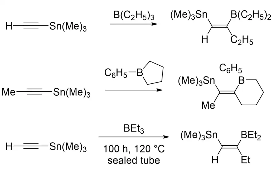 - ^ Wrackmeyer, B.; Menz, G. (1977). "Organoborierung von Alkinylstannanen, III1 Zur Reaktion von Trialkylboranen mit Monoalkinylstannanen / Organoboration of Alkynylstannanes, III The Reaction of Trialkylboranes with Monoalkynylstannanes". Zeitschrift für Naturforschung B (in German). 32b (12): 1400. doi:10.1515/znb-1977-1209. S2CID 98409890.