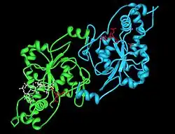 ![]() Example carbohydrate sulfotransferase with PAPS cosubstrate and carbohydrate substrate: Crystal Structure of human 3-O-Sulfotransferase-3 with bound PAPS and tetrasaccharide substrate. Enzyme chain A (blue), Enzyme chain B (green), PAPS (red), tetrasaccharide substrate (white), sodium ion (purple sphere).[1] | |||||||||